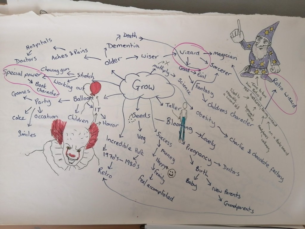 The second topic to look into was grow. Again, I began with simple terms like “growing older,” “growing taller,” and “growing seeds.” These ideas, however, produced some unusual concepts such as wizards, horror, and special powers.