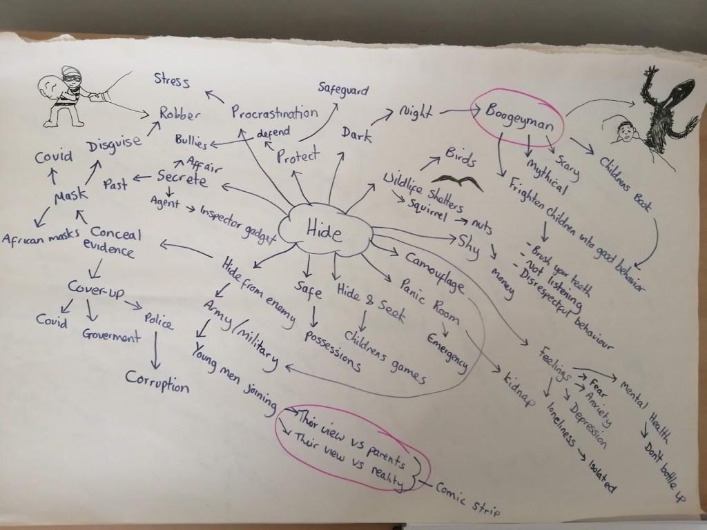 The third theme was hide. This was a little more difficult for me to think of words at first, yet I soon got terms like hide and seek, hide from the enemy, and protect. This sparked three ideas for future projects: Boogeyman, Robber, and a comic strip depicting the realities of joining the military against the parents’ perspective. This final project idea probably came to me because my son is planning to enlist in the Royal Air Force.