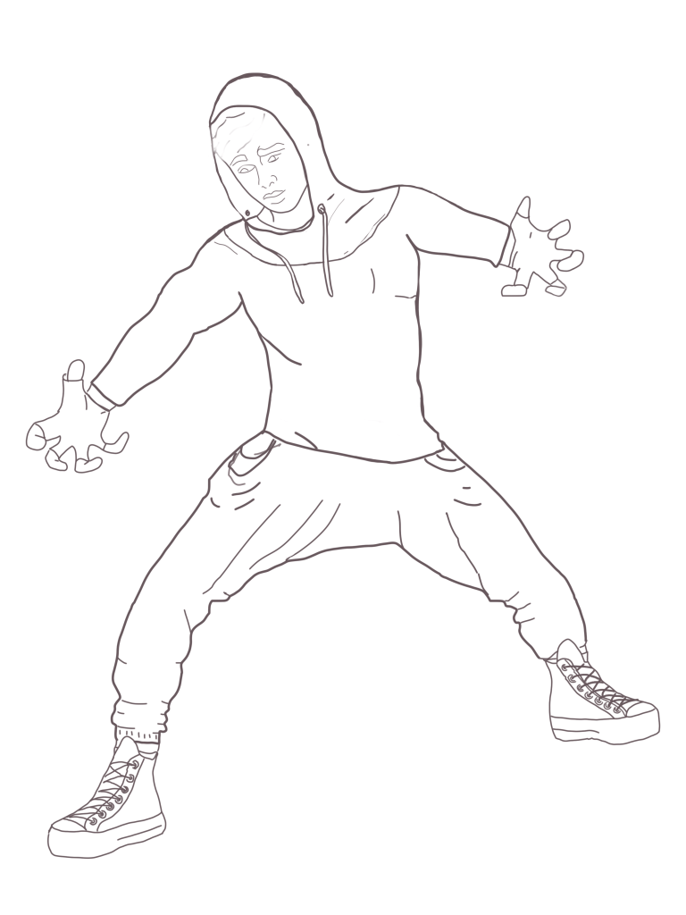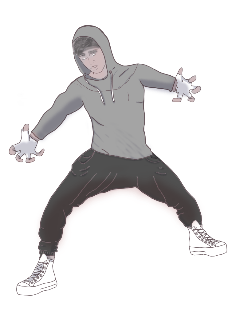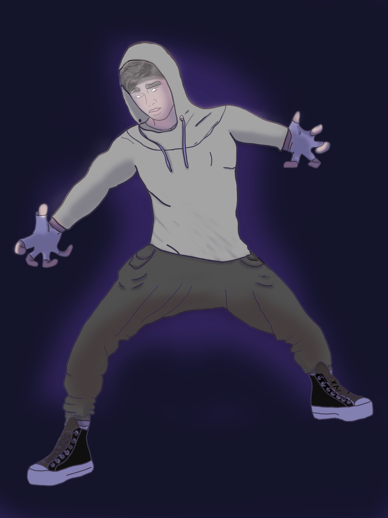 Selecting the brush tool in Adobe Photoshop I sketched out a more detailed drawing of the young wizard. I wanted him to be young and trendy so dressed him in a hoody, skater gloves, baggy trousers and Converse trainers.