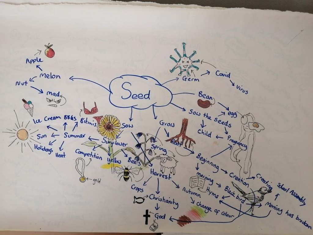 The fourth topic was seed. This was my least favourite notion, and I had the most difficulty coming up with fresh words for it. Each of the words was self-explanatory, such as sow, grow, and harvest. God, COVID, and Mad were the most far from my starting point for the word seed. However, when compared to the earlier spider diagrams, I didn’t believe these were viable ideas for a new project.