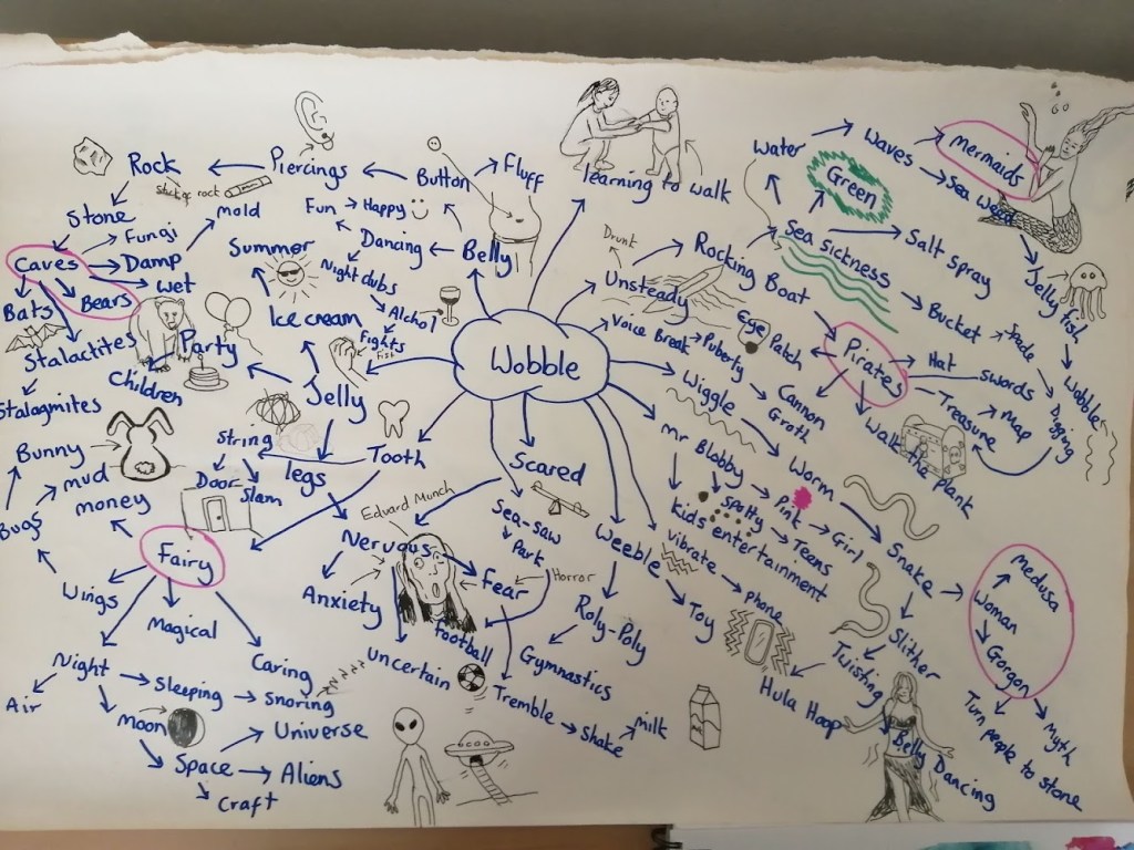 Wobble was the final word to be investigated. This word inspired the most ideas for me. I started out with words like teeth, jelly, scared, and unstable. However, the more I brainstormed, the more bizarre concepts I came up with, such as mermaids, bears, fairies, wizards, and Medusa, which surprised me.