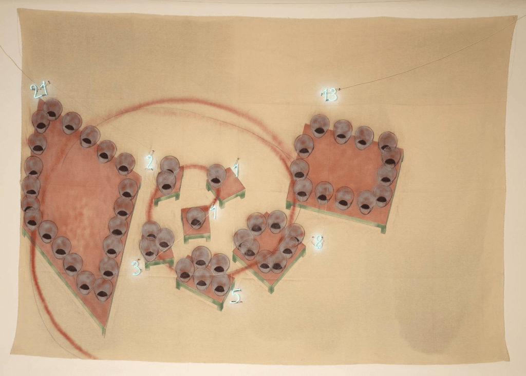 One of Merz’s most iconic works is his igloo series. From the 1960’s until his death, he made thirty of these sculptures. These igloos are made from various materials, including clay, glass, and metal, and again they often incorporate the Fibonacci sequence in their construction. The use of the igloo symbolises the idea of shelter and the interconnectedness of human beings and nature.