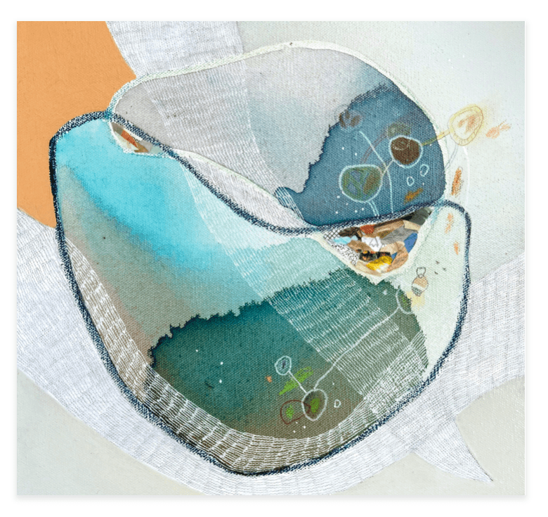Linden Eller is a mixed media artist who uses a variety of materials such as a variety of papers, tracing paper, found fragments, sewing thread, paint and pastels.