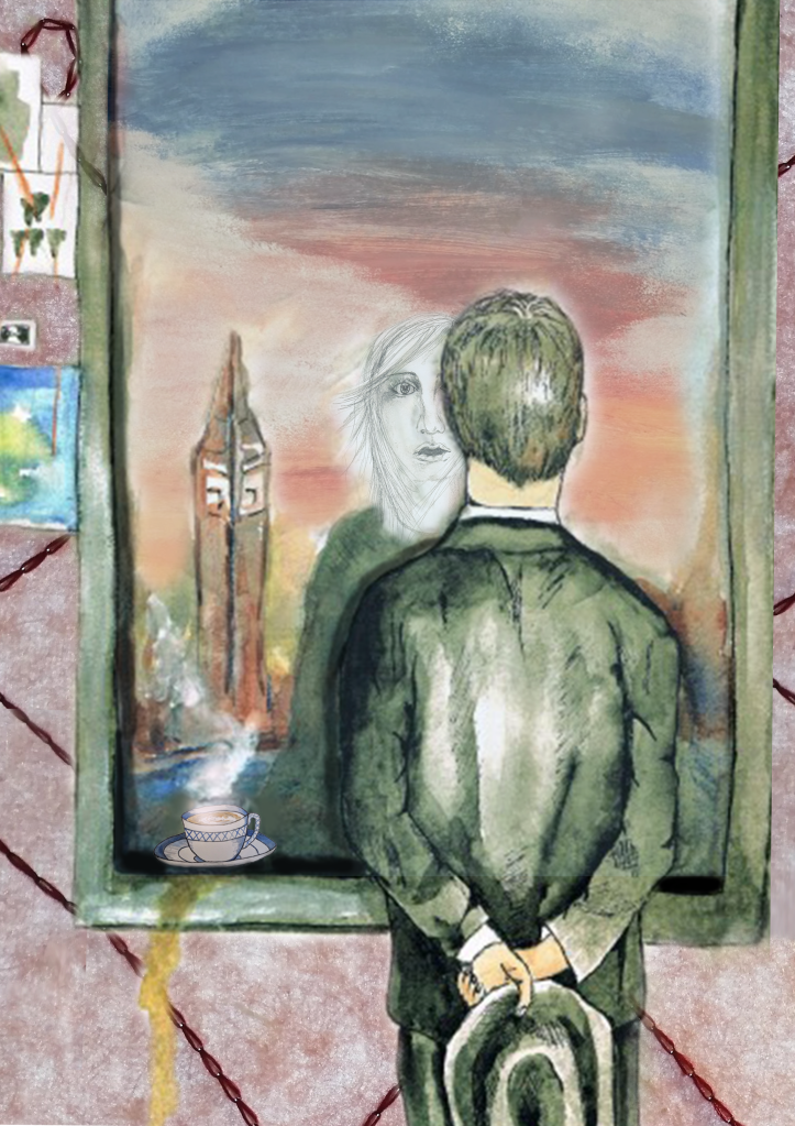 At first, when creating this collage, I carefully arranged the different elements: the man in a suit gazing out at the city through the window, the teacup, the troubled expression of the woman, and the textured paper. I experimented with various sizes for each element, thinking about how to incorporate the woman’s face into the collage. As I got further into the process, my thoughts turned to transgender individuals and those who struggled with their desire to embrace a different gender. Considering how some may struggle, denying and concealing their inner thoughts. In this collage, as the man looks out the window, he is met by his reflection as a woman, appearing fearful.