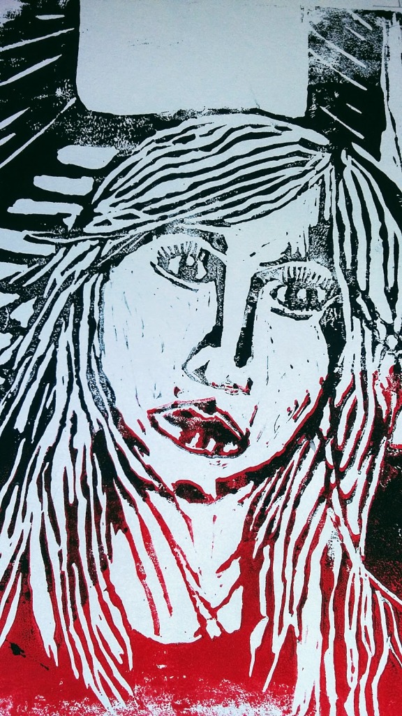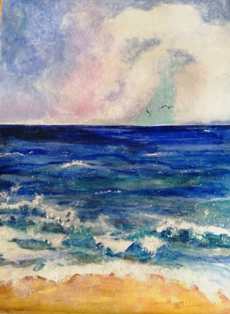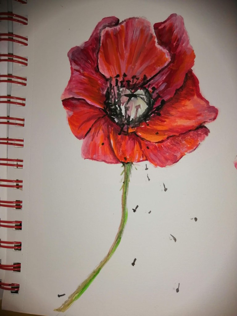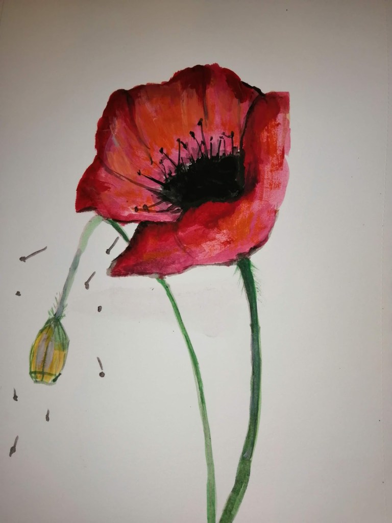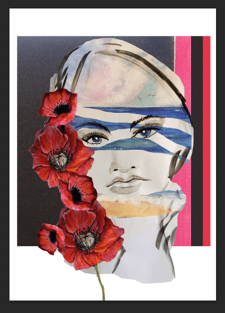 For the last collage, I wanted to be experimental and chose to use a lady’s face I painted with black Indian ink, a sea scene I painted in acrylics, poppy flowers I painted in acrylics and a black and pink background.