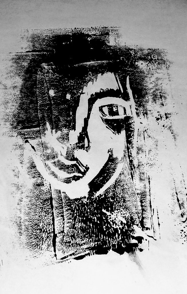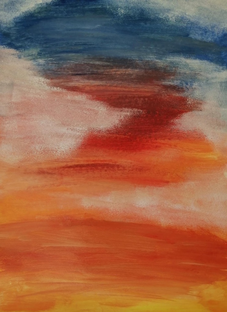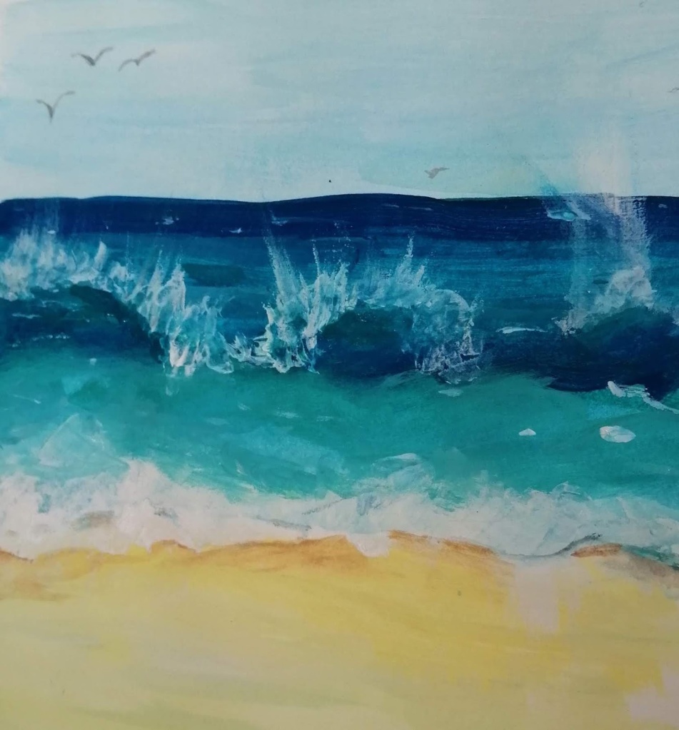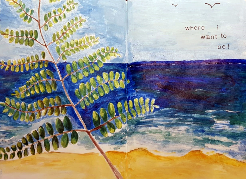 For the last collage, I wanted to be experimental and chose to use a lady’s face I painted with black Indian ink, a sea scene I painted in acrylics, poppy flowers I painted in acrylics and a black and pink background.