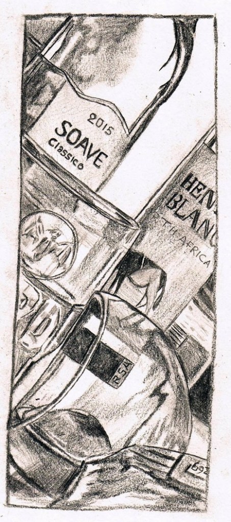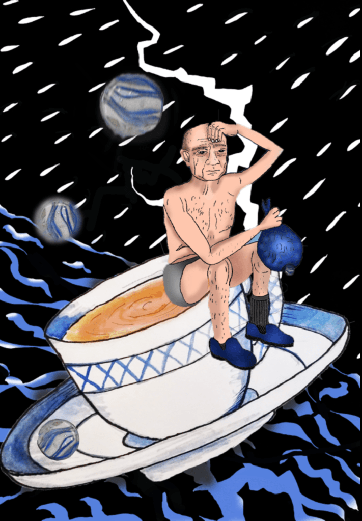 For this collage, I just tried to be playful and see what the outcome would be. It includes a man sitting in his underwear and slippers, perched on the edge of a flying teacup soaring through the sky. With the addition of marbles swirling through the air and escaping from the man’s bag to add a little humour. I found this collage amusing as friends and family think the man I drew in the picture is my husband which was not intentional.