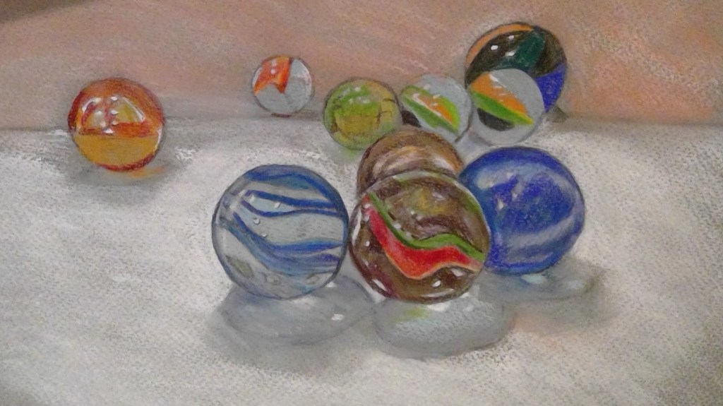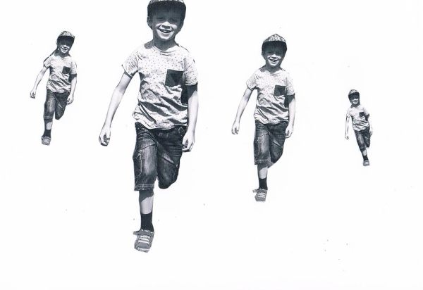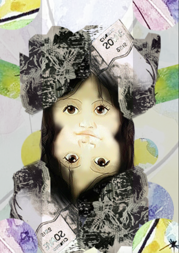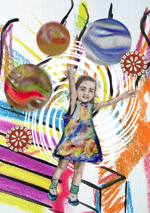 I enjoyed creating this collage as it was a much more lighthearted collage than some of the others I’ve worked on. The image of the young girl is actually a drawing I did of my best friend’s daughter. I wanted to capture her joyful personality, which is why I opted for a colourful background. The added marbles in the collage were meant to convey the feeling of them spinning in the air after she had thrown them, adding an element of movement and playfulness to the overall composition.