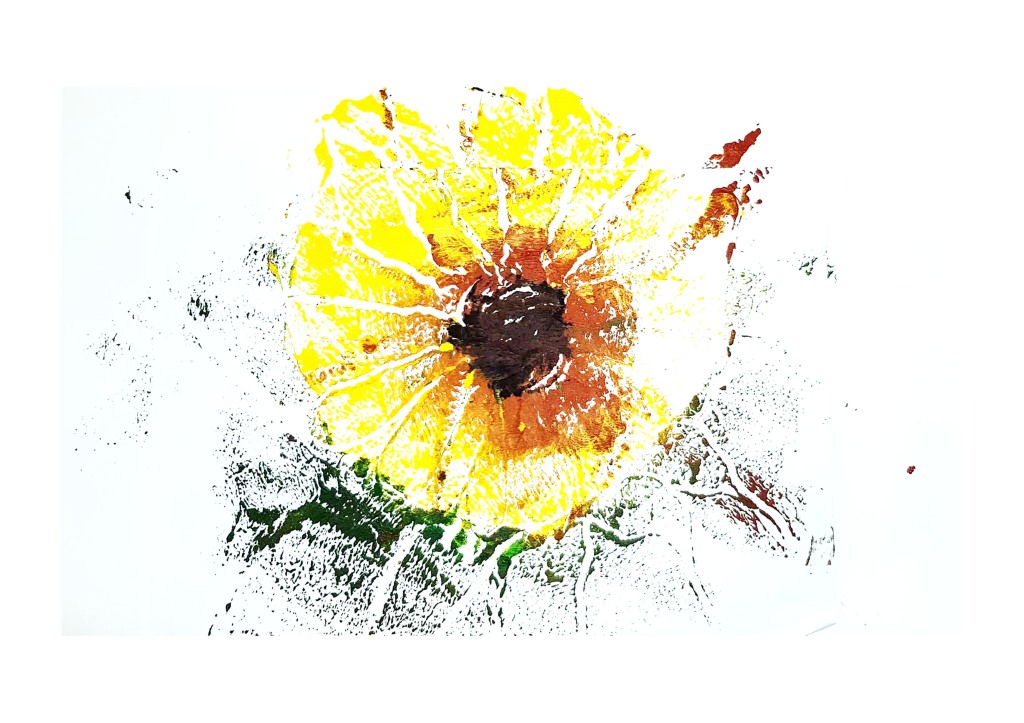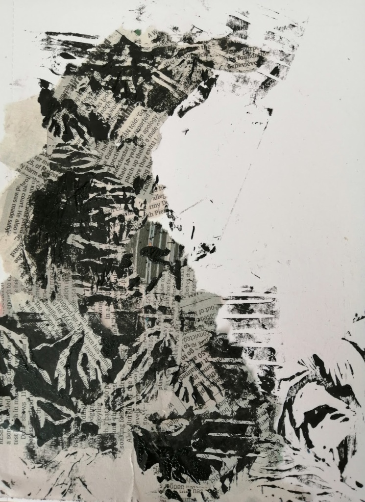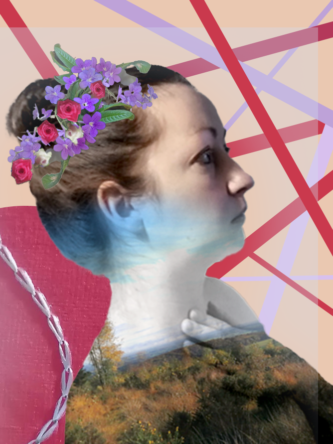For this collage, I tried to create an artwork that is more about creating something aesthetically pleasing. To do this I used a pattern green background, illustrations of sunflowers that I had previously painted and an image of myself taken on one of my favourite walks. I also added a pastel pink shape lowered the opacity of it and layered it over my top. I felt this added a soft and gentle contrast to the vibrant green and added a visual interest.