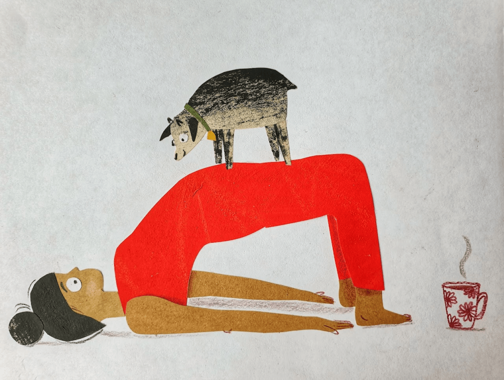 Finally, the last artist I researched is a Swiss illustrator and author called Martina Aiko. Again, this artist works in a very similar style to the previous two, creating illustrations entirely by hand. Her work consists of mixed media and collage. Like the other two artists, her style and intricate designs captured my attention immediately. Below are some examples of her work. You can see the attention to detail and creativity that go into each piece. The illustration below made me laugh, and I resonated with the image as it reminded me of doing pilates in my lounge, where my pet chihuahua Leo, he will often come and sit on me while I exercise.