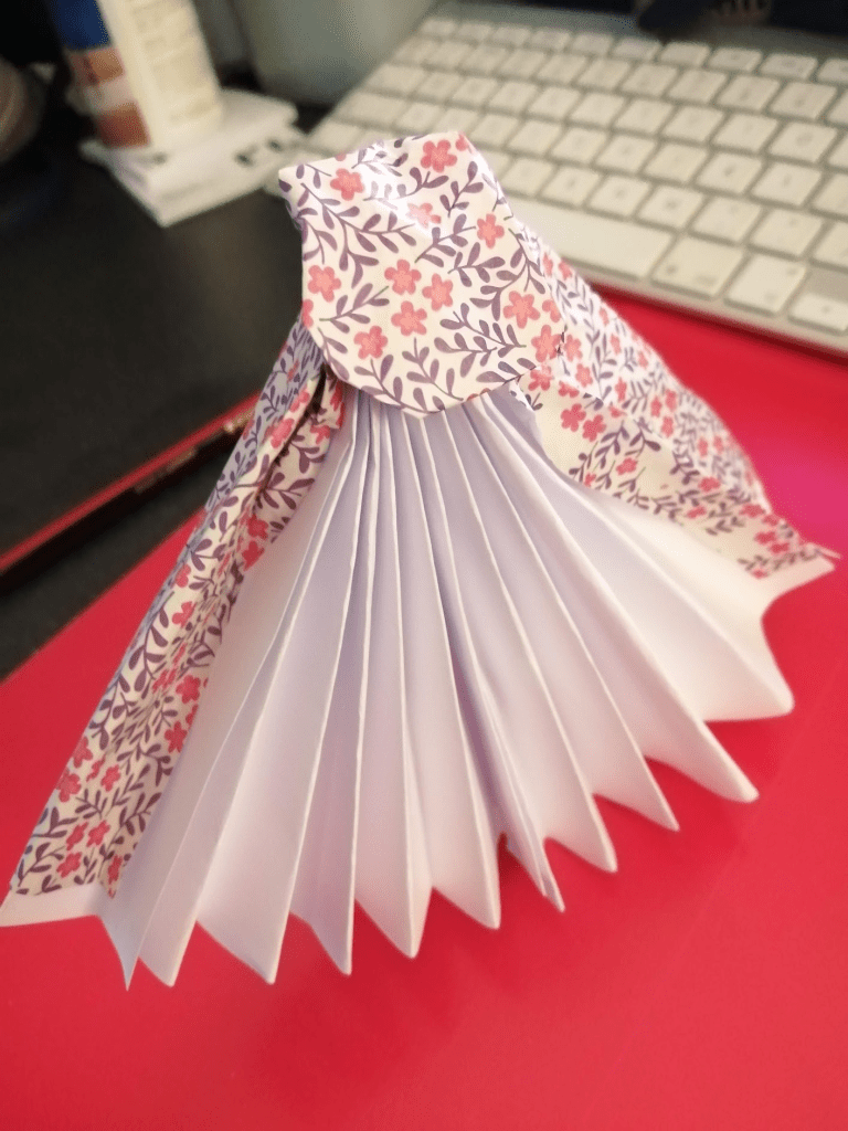 I started by making a paper fan, folding it in half, and then adhering the edges together. This looked like a skirt to me, so I covered a portion of it with origami paper that was decorated with lovely flowers and folded it into the paper.
