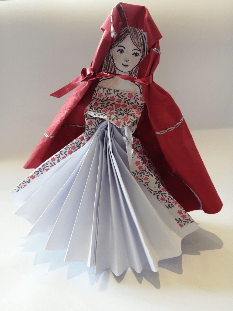 However, I was a little naive, thinking it would be fairly simple. I quickly realised that origami requires a lot of precision, patience, and attention to detail to create intricate designs. I don’t know if it is a lack of practice or if having dyslexia plays a part in finding origami difficult, but I found it extremely hard to master the art of folding paper into complex shapes. However, being stubborn, I spent several days attempting to make the above character. The reason I liked this figure so much is because it reminded me of Little Red Riding Hood, and I thought if I could make it, then I could make other characters from the story and possibly create my own unique versions of the classic fairy tale.
