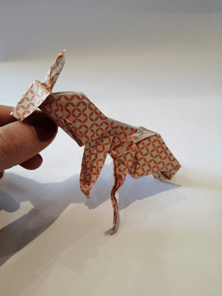 After being satisfied with the result I obtained earlier, I decided to try my hand at making an origami wolf. However, I underestimated the difficulty of the task again and ended up creating a sculpture that my husband thought resembled a cricket instead of a wolf. Nonetheless, I refused to give up and started again.