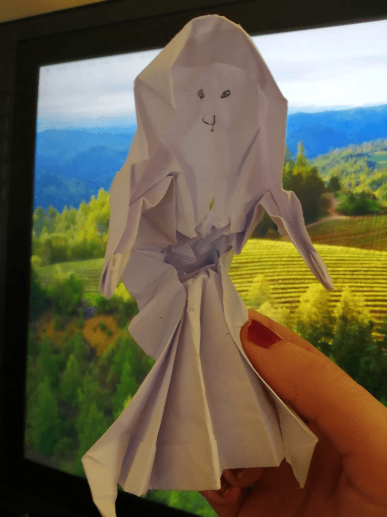 In the meantime, my eleven-year-old and sixteen-year-old children saw what I was doing and thought it looked easy. They decided to try creating the characters that I had found too difficult to make. To my frustration, both of them managed to create perfect origami sculptures in just one hour, despite it being their first attempt. Below are their sculptures.