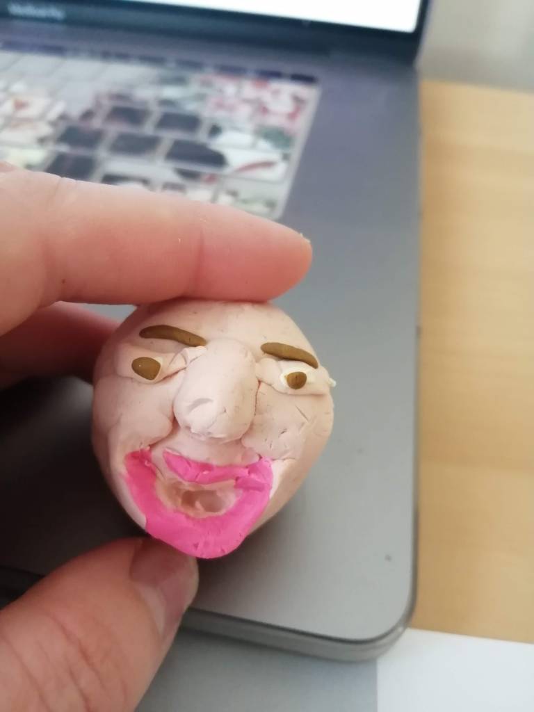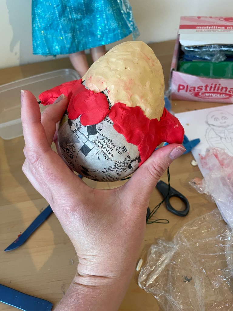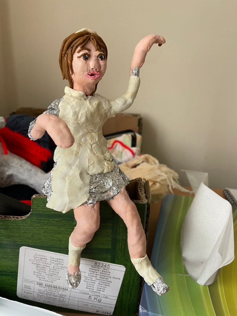 When the sculpture was finished and had dried, I coloured it with acrylic paint and sanded it with a nail file. Finally, I built a plasticine crown and incorporated it into the figure.