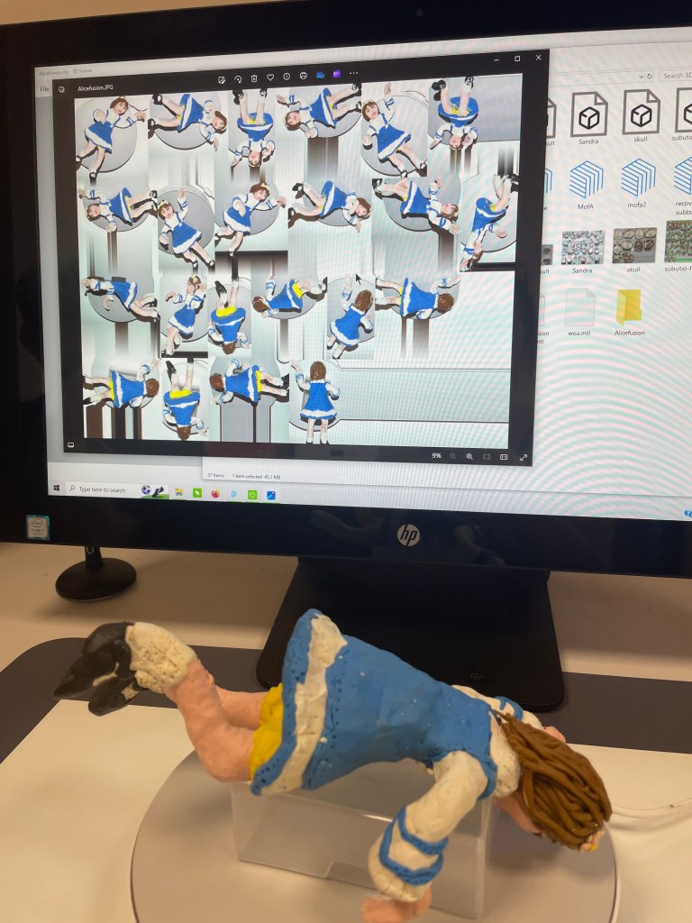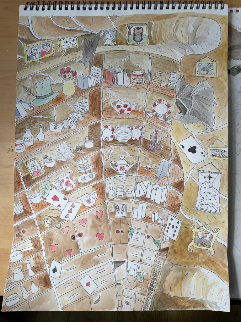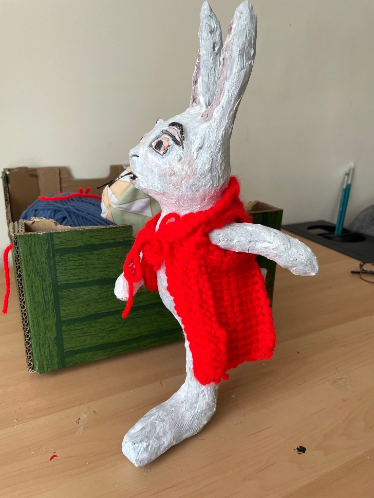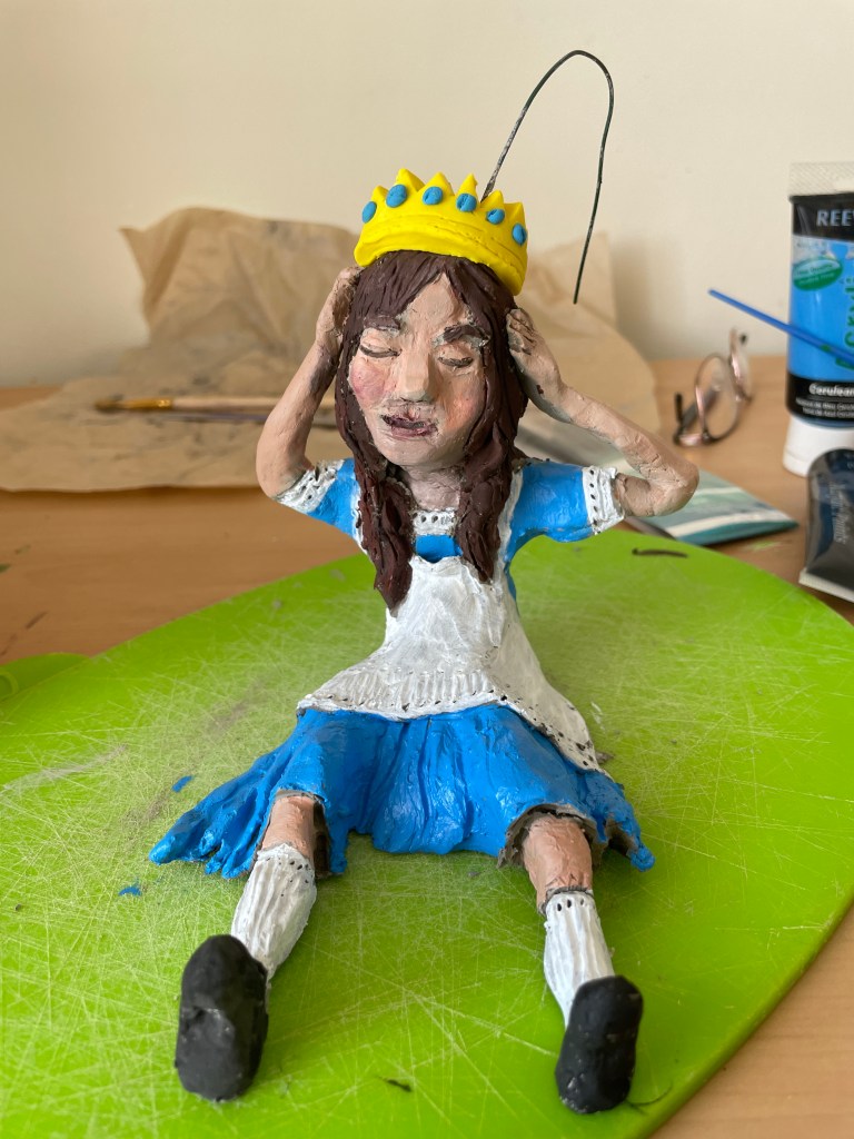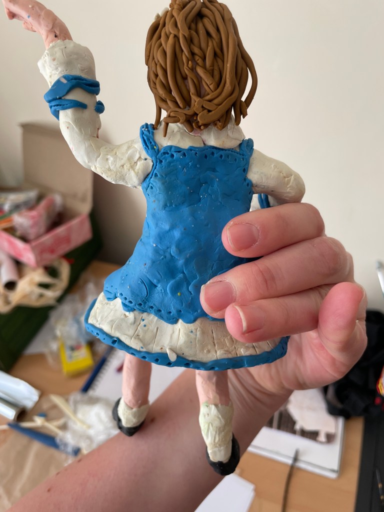 “Completing my project based on Through the Looking Glass and receiving feedback from my tutor was both a nerve-wracking and a rewarding experience. I often feel apprehensive about how my work will be received and whether I’ve done enough to meet expectations. However, I was delighted to hear that my tutor was blown away by my efforts, particularly in handmade crafting, the stunning illustrations I created, and my integration of technology. She also recognised my initiative in learning Blender, expressing eagerness to see the animation I am currently working on. My tutor has also encouraged me to start marketing myself, and playfully adviced me to display my sculptures at home rather than sell them. This feedback gave me a renewed sense of confidence in my abilities. Hearing her say, ‘ If you don’t have confidence now you never will, well done Gemma,’ and that she was impressed and blown away by my work was incredibly affirming, and it’s a reminder to trust in my creative instincts moving forward.”
