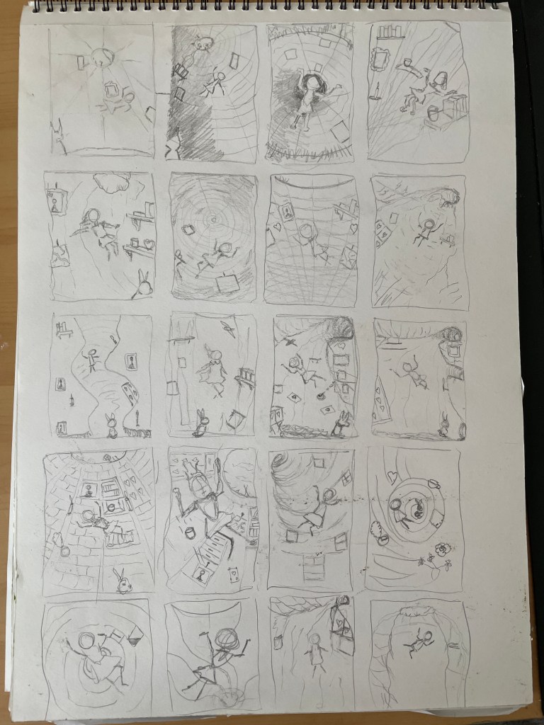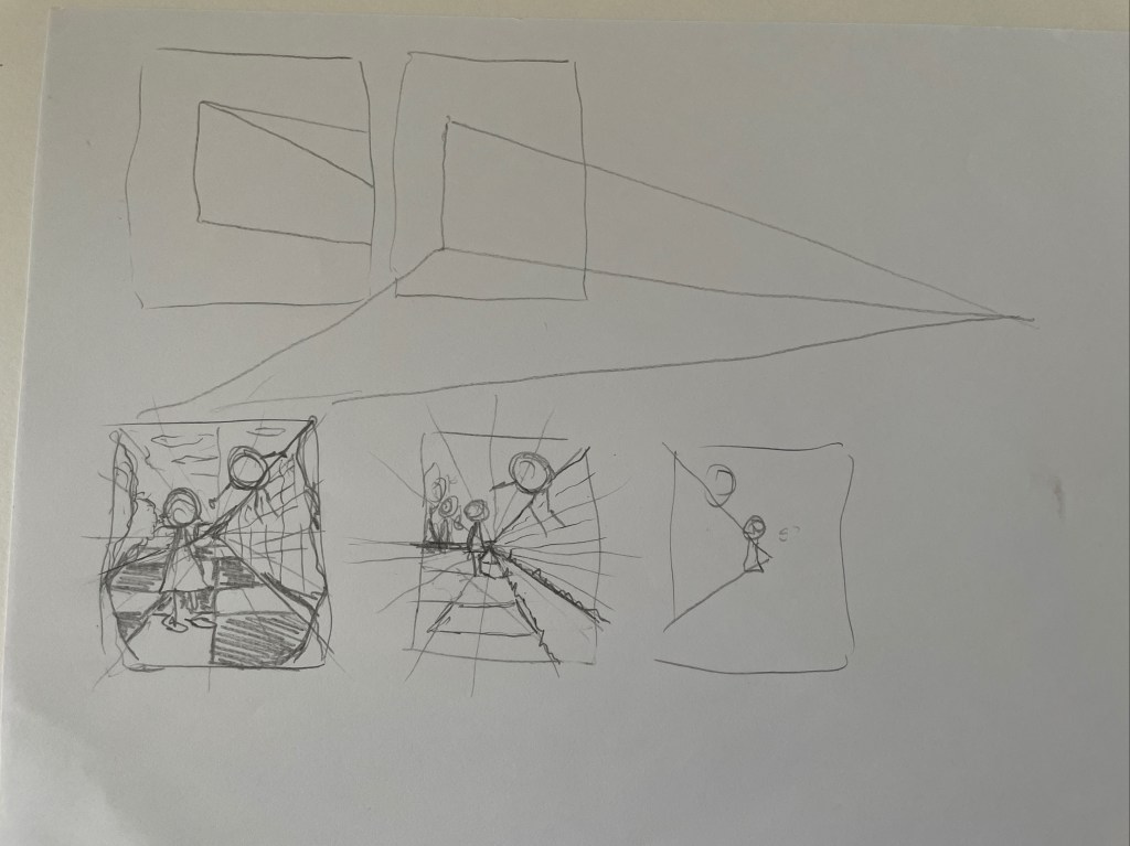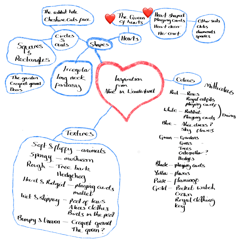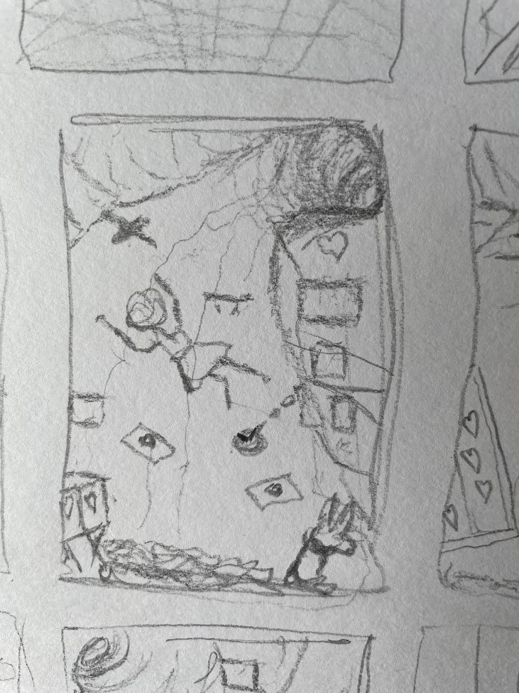 Next, I began creating a series of sketches and notes on the characters, scenes, and themes from Through the Looking Glass that resonate with me and focused on how I can reinterpret these elements in unexpected ways.