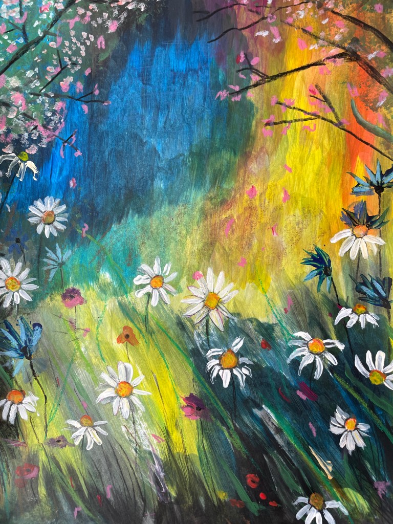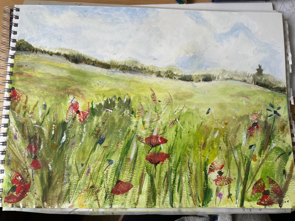 Next, I started drawing a background of a beautiful grassy field in my A3 sketchbook using acrylic paint, pastels and crayons.