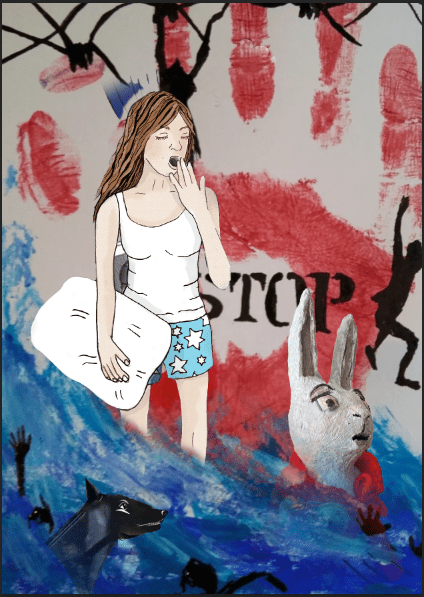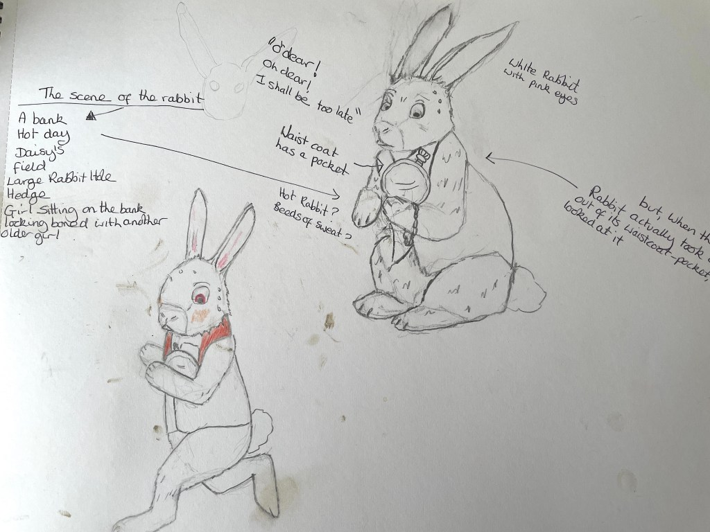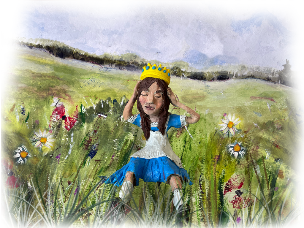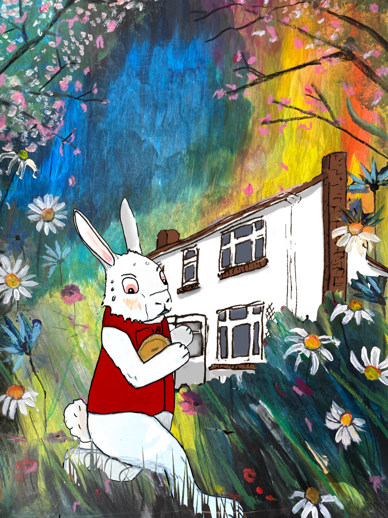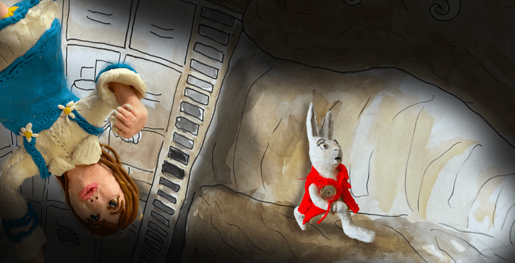 Previously, in assignment four, I created 3D clay sculptures and hand-painted backdrops around the theme of imagination, focussing my work on the story of Alice in Wonderland. These artworks included 3D clay sculptures of Alice and the white rabbit, which I photoshopped into hand-painted backdrops. These can be seen here: