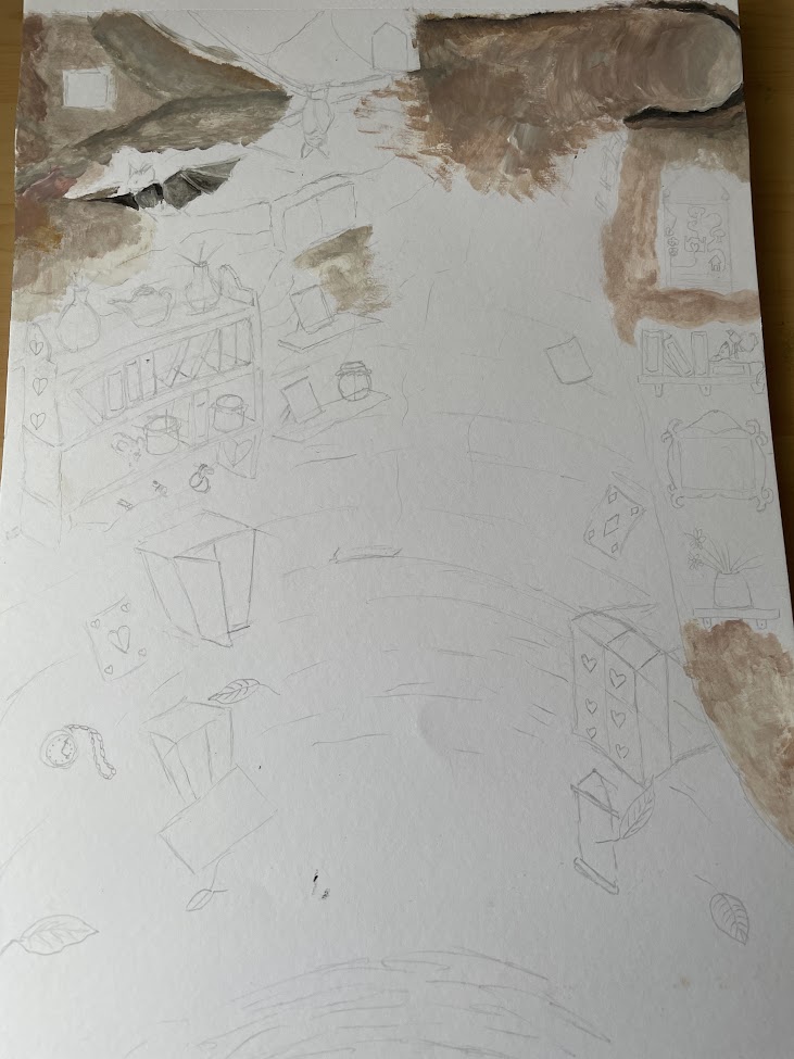 Next, I began drawing and painting the background on an A3 sketchbook. Mixed media was used for this such as watercolour, crayon and pastel some applied with brushes or sponges.