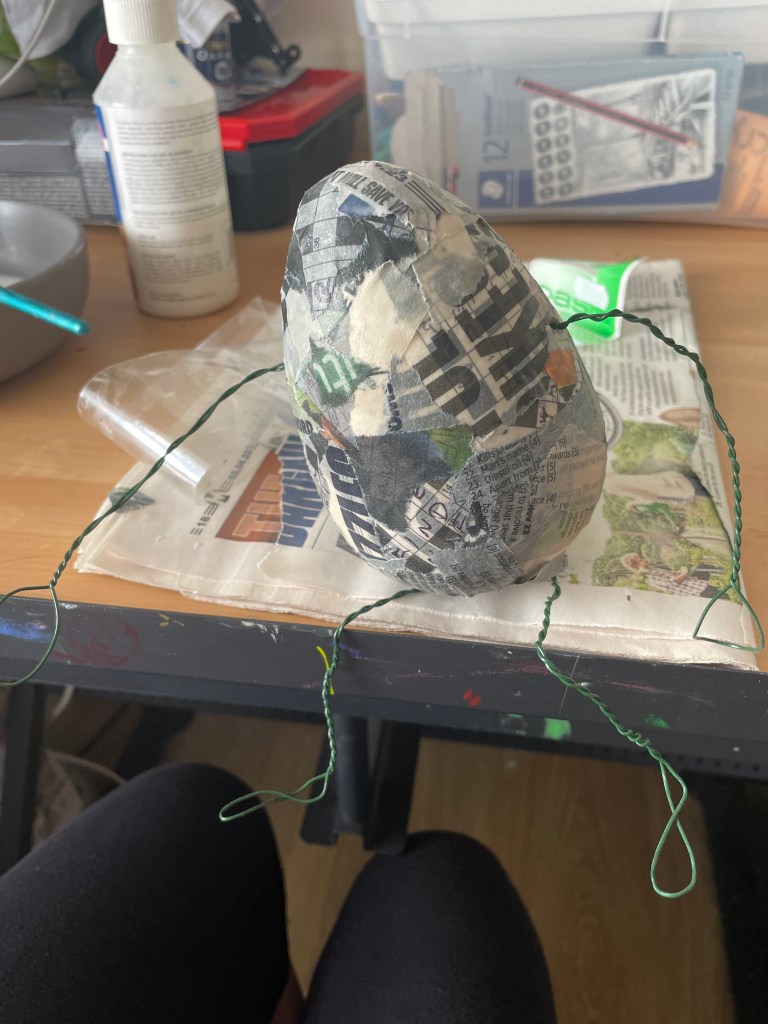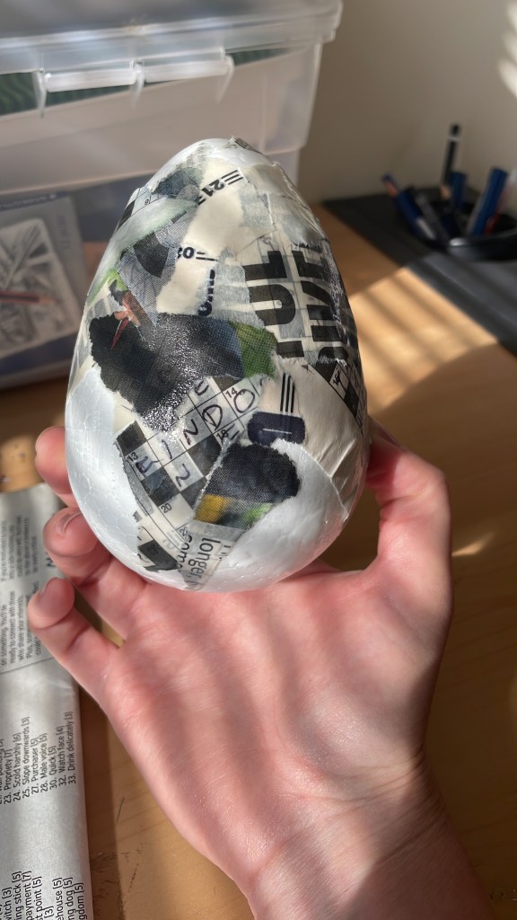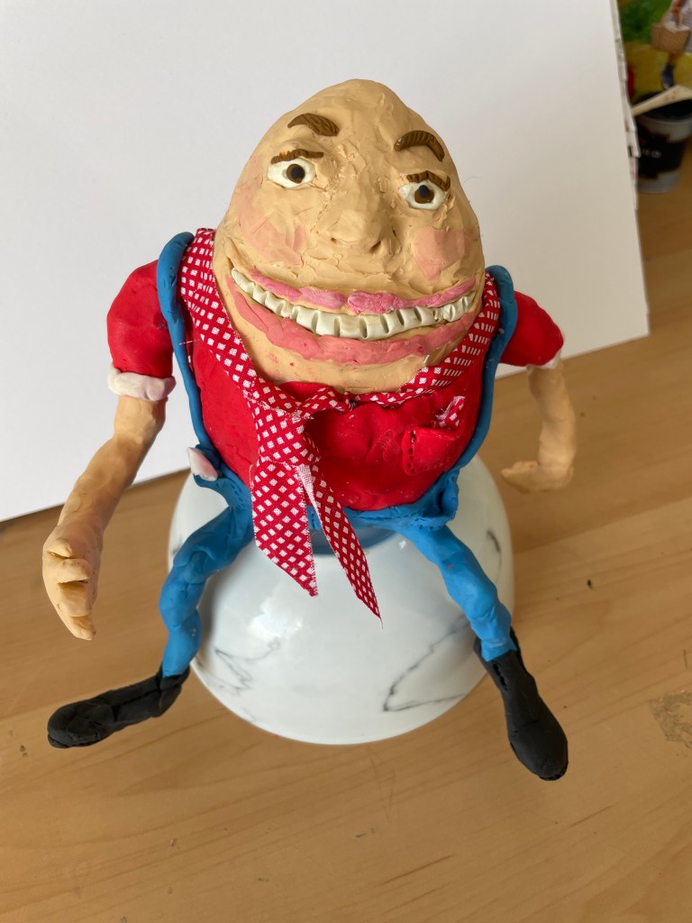 After producing thumbnails and experimenting with various compositions, I started to build a 3D model of Humpty Dumpty, I went to my local recycling centre to check if they had anything I could use for this project. I was excited to discover a Styrofoam egg and an old vintage doll. Both I thought would be good for this project.