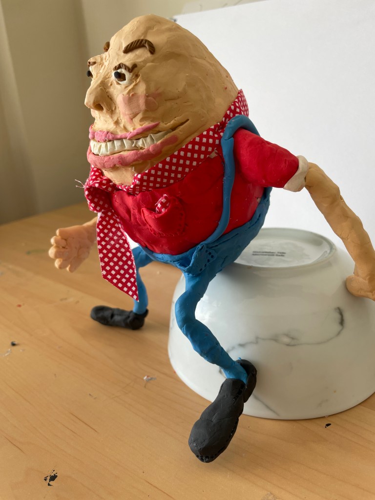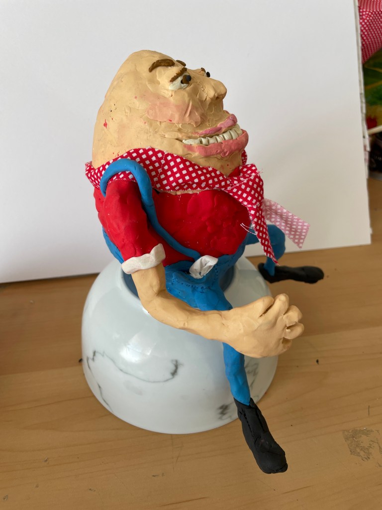 After I bought them, I started sculpting the egg with floral wire for the arms and legs, and I then added plasticine to finish sculpting the area surrounding the egg. When I was done, I added finishing details like a tissue to his pocket and a cravat I created out of some leftover cloth. A slide show of my work in progress is shown below.