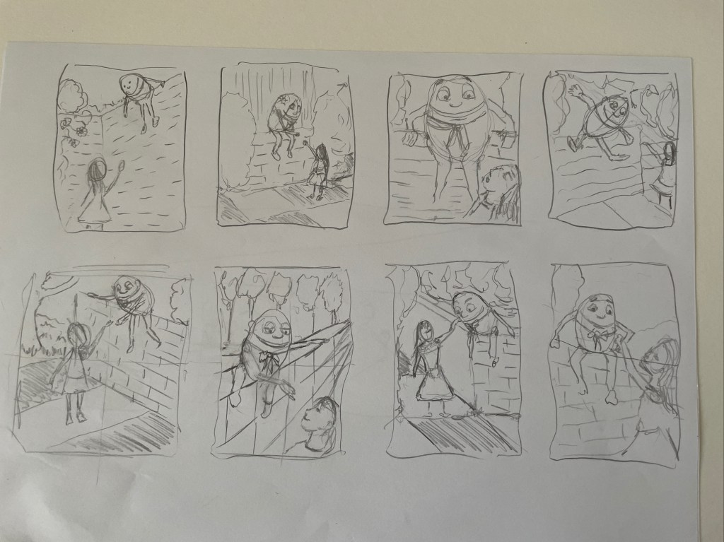 Working out the composition and perspective for Alice and Humpty Dumpty meeting each other