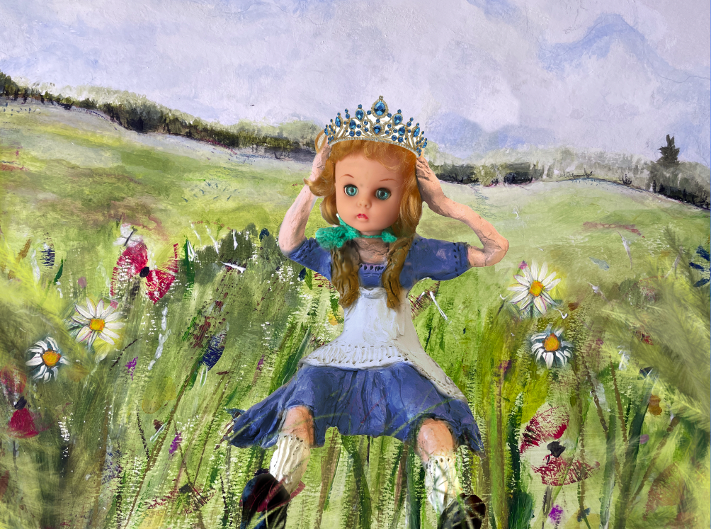 It was now time to use Photoshop to improve the painting and add the characters. This last picture features the vintage doll dressed as Alice alongside phrases from the book “Through the Looking Glass” collaged on top.